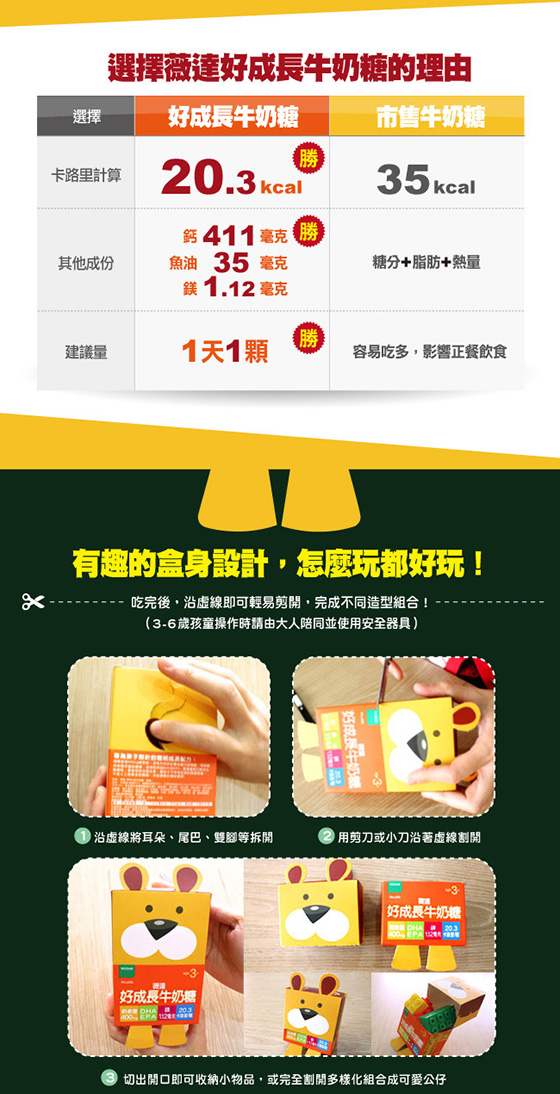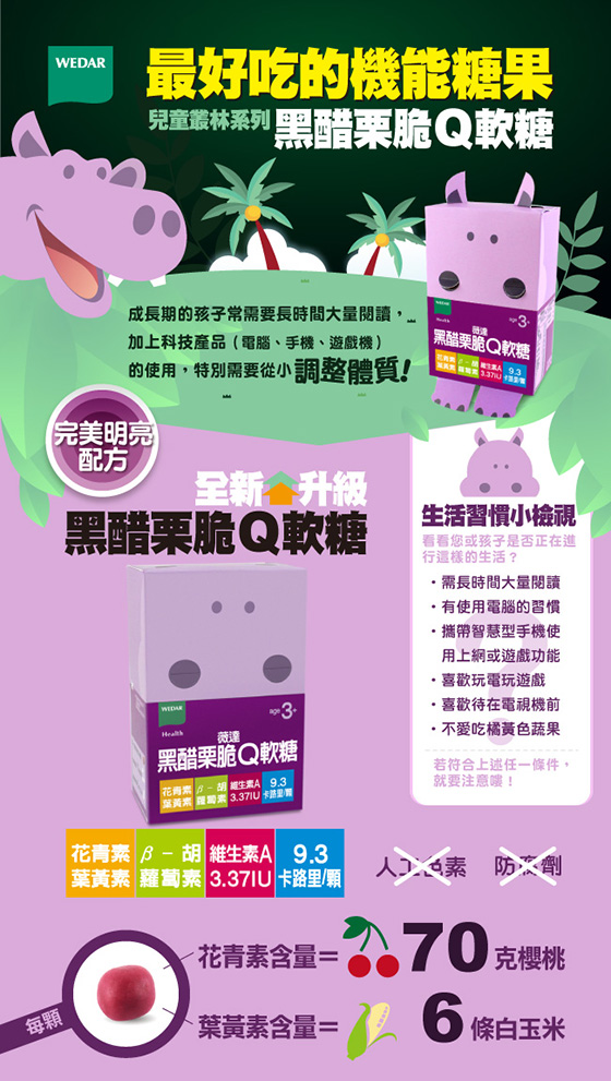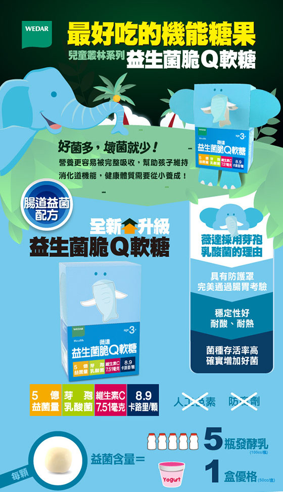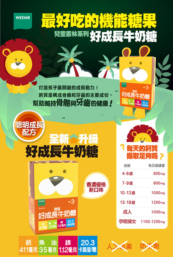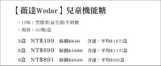 健康強壯的體格,就要從小建立起, ![]() ![]() ![]() ![]() ![]() ![]() ![]() ![]() 商品規格 商品名稱:《薇達Wedar》兒童機能糖 黑醋栗 規格:2.5公克/顆,30顆/盒 主要成分:黑醋栗萃取物(含35%花青素)、金盞草萃取物(含5%葉黃素)、β-胡蘿蔔素10%、綜合維生素礦物質(維生素A、維生素C、維生素D、維生素E、維生素B1、維生素B2、菸鹼酸、維生素B6、維生素B12、生物素、本多酸鈣(泛酸鈣)、焦磷酸鐵、碘化鉀、碳酸鈣、氧化鎂、氧化鋅、亞硒酸鈉、葡萄糖酸銅、硫酸錳)、砂糖、麥芽糖、柑橘果膠、椰子油、葡萄濃縮果汁、紅甜菜色素(食用天然色素)、焦糖色素(食用天然色素)、檸檬酸(調味劑)、香料。(本產品不含人工色素及防腐劑) 建議用量:每日1~2顆,餐後食用。 注意事項:請存放在陰涼乾燥處。 劑型:脆Q軟糖,奶素。 益生菌 商品規格:2.5公克/顆,30顆/盒 主要成分:芽孢乳酸菌(Bacillus coagulans,6*109 CFU/公克)、綜合維生素礦物質(維生素A、維生素C、維生素D、維生素E、維生素B1、維生素B2、菸鹼酸、維生素B6、維生素B12、生物素、本多酸鈣(泛酸鈣)、焦磷酸鐵、碘化鉀、碳酸鈣、氧化鎂、氧化鋅、亞硒酸鈉、葡萄糖酸銅、硫酸錳、砂糖、麥芽糖、柑橘果膠、椰子油、奶粉、檸檬酸(調味劑)、香料。(本產品不含人工色素及防腐劑) 建議用量:每日1~2顆,餐後食用。 注意事項:請存放在陰涼乾燥處。 劑型:脆Q軟糖,奶素。 牛奶糖 商品規格:6公克/顆,30顆/盒 主要成分:牛奶鈣(含鈣26%)、碳酸鈣(含鈣38%)、水溶性魚油粉末Omega H2O® Powder(含EPA+DHA 1%)、綜合維生素礦物質(維生素A、維生素C、維生素D、維生素E、維生素B1、維生素B2、菸鹼酸、維生素B6、維生素B12、生物素、本多酸鈣(泛酸鈣)、焦磷酸鐵、碘化鉀、氧化鎂、氧化鋅、亞硒酸鈉、葡萄糖酸銅、硫酸錳)、水飴、砂糖、奶粉、椰子油、鹽、優格濃縮液、DL-蘋果酸(調味劑)、卵磷脂(乳化劑)。(本產品不含人工色素及防腐劑) 建議用量:每日1顆,餐後食用 注意事項:請存放在陰涼乾燥處。本產品會因時間、溫度及濕度影響產生顏色及軟硬度變化,此為正常現象,請安心食用。本品容易因溫度及濕度影響,導致軟硬度改變,此為正常現象,敬請安心食用。 劑型:軟糖、葷 警語:為避免噎食,三歲以下幼兒需由成人陪同食用。請咀嚼,勿整粒吞食。 原產地:台灣 保存期限:2年 食品業者登錄字號:E-116507454-00000-4 |