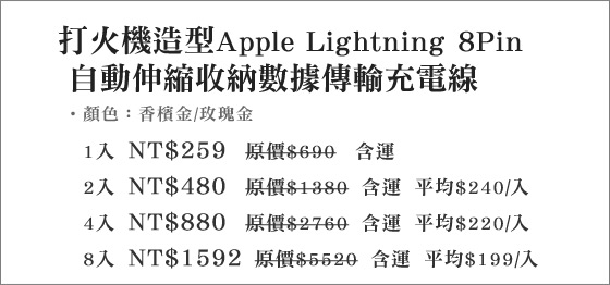 打火機造型Lightning 8Pin數據傳輸充電線該商品熱烈銷售中~ 避免向隅,欲購從速~走過路過,千萬不要錯過!請參閱詳細商品資訊打火機造型Lightning 8Pin數據傳輸充電線MANDY一向是個理性的消費者,能讓他讚賞的商品不多了!網路購物EC是擋不住的趨勢,可以方便比價只要用功通常都能買到相對便宜的商品!售價隨時會調整;特價有時效性,有需要的人動作要快! |