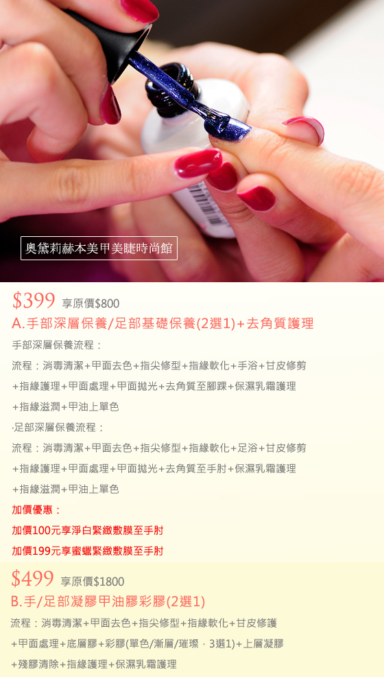 | 奧黛莉赫本美甲美睫時尚館-深層保養/凝膠甲油膠彩膠方案-團購獨家!百貨公司櫃姐最愛,距捷運中山站步行一分鐘可抵達!擁有專業的美甲經驗與技術,給予不凡指間風采只要399元起即可享受【奧黛莉赫本美甲美睫時 售價:399 我要購買 |